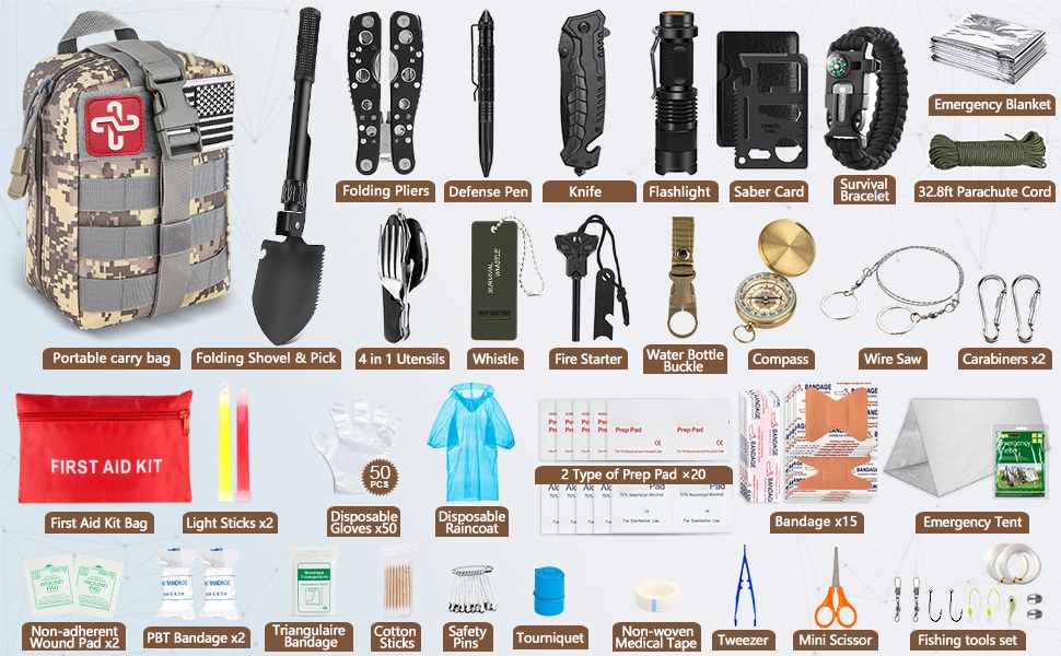 Kit Kemandirian Kecemasan 238Pcs dan Kit Pertolongan Cemas direka bentuk untuk pejalan kaki, berkhemah, pasukan penyelamat dan sesiapa sahaja yang bersedia untuk kecemasan luar yang tidak dijangka. Menggunakan bahan tahan lama, tahan cuaca dan gred profesional komponen, inikit menyediakan alatan penting untuk hidup, navigasi, pertolongan cemas dan isyarat kecemasan.