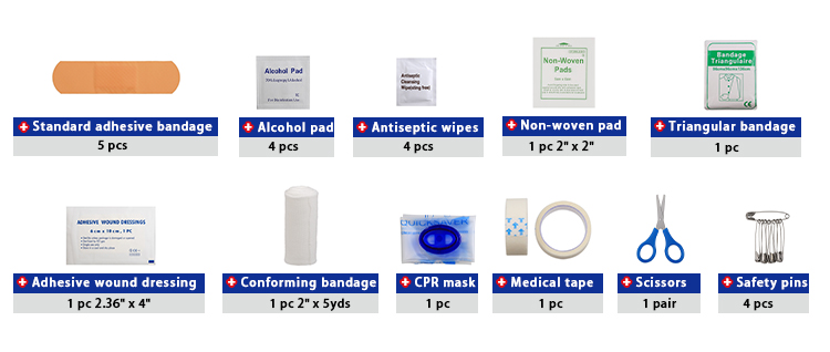 Termasuk item pertolongan cemas asas untuk kecederaan ringan dan kegunaan harian