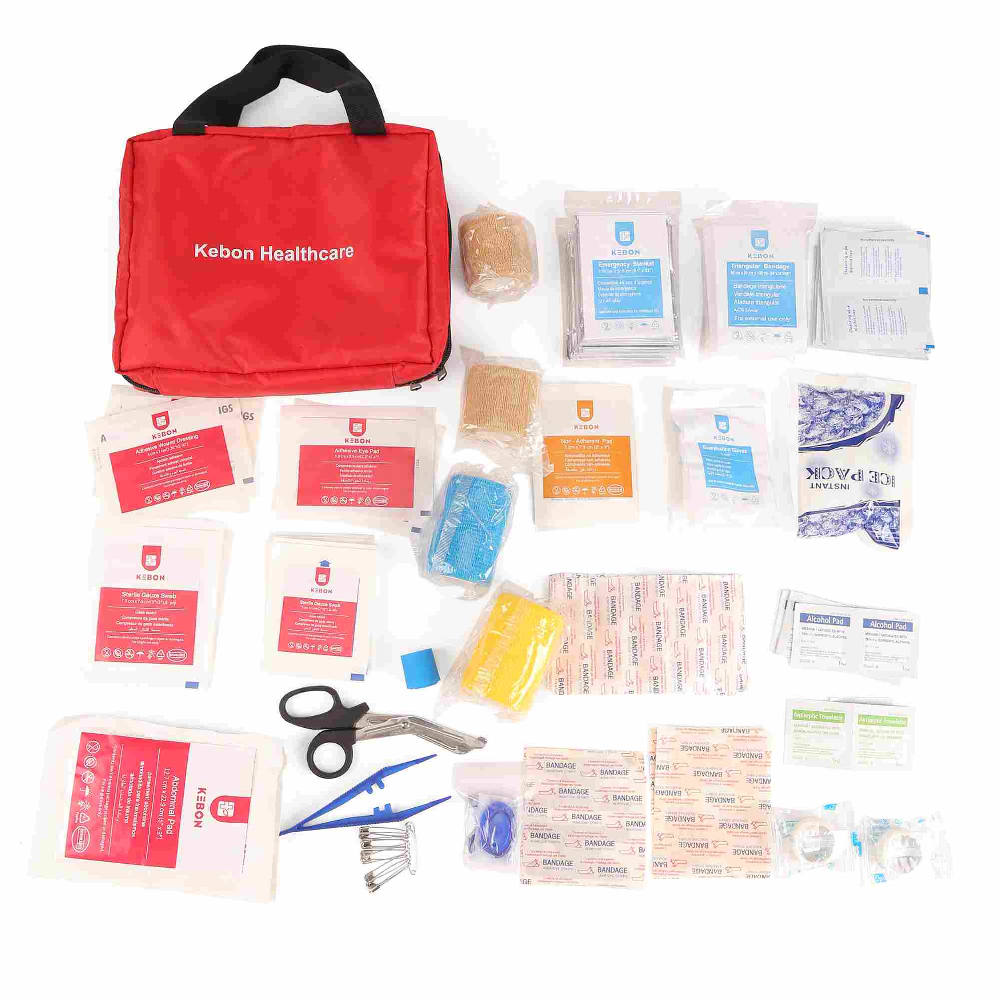 KategoriBarang Termasuk Pembalut Steril Pembalut kasa, pembalut luka steril, pad penyerap Pembalut & Balutan Pembalut elastik, pembalut segi tiga, pita pelekat Penjagaan Luka Pembalut pelekat bercampur, pad alkohol, kain lap pembersihAlat KecemasanGunting, pinset, pin keselamatan, pita perubatan pakai buang Lain lembaran plaster luka