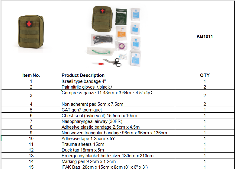 Yiwu Kebon Healthcare Co., Ltd menyediakan penyesuaian OEM/ODM untuk organisasi tentera, polis dan penyelamat. Warna beg, logo dan kandungan dalaman boleh disesuaikan sepenuhnya mengikut spesifikasi pelanggan atau piawaian pertahanan negara.